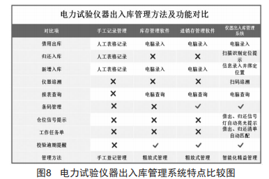 電力試驗儀器出入庫管理系統(tǒng)開發(fā)完成后,在珠海供電局高壓試驗所進行試運行,經(jīng)過反復(fù)測試與系統(tǒng)優(yōu)化,現(xiàn)已圓滿解決電力試驗儀器出入庫管理中的三個難題,試驗儀器借出、歸還可實現(xiàn)精準(zhǔn)定位信號燈開啟提示,查找時間由原來的單次查找逾10min縮短為1min以內(nèi):批量試驗儀器借出、歸還實現(xiàn)了工作任務(wù)單模板化管理,時間由原來的20min縮短為3min以內(nèi)。電力試驗儀器出入庫管理系統(tǒng)建成后,其綜合功能超越原有手工管理以及市面上所有軟件管理系統(tǒng),如圖8所示。