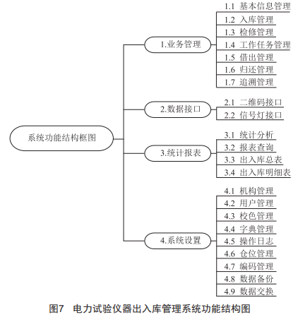 如圖7所示,電力試驗儀器出入庫管理系統(tǒng)可分為4個一類功能模塊:業(yè)務(wù)管理、數(shù)據(jù)接口、統(tǒng)計報表、系統(tǒng)設(shè)置:22個二類功能。