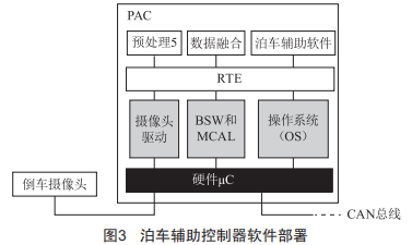 針對(duì)泊車輔助功能,按圖1在PREEviSiOn中搭建泊車輔助功能軟件架構(gòu)模型(SWC、端口、Interface/DE、數(shù)據(jù)類型等),并進(jìn)一步詳細(xì)定義各SWC的內(nèi)部行為,如RTEEvent、Runnab1e、變量等。這些軟件組件屬于AUTOSAR應(yīng)用層,完全獨(dú)立于硬件,可在不同項(xiàng)目、不同平臺(tái)中實(shí)現(xiàn)復(fù)用。之后,將各功能部署到對(duì)應(yīng)控制器并進(jìn)行信號(hào)路由,完成通信層設(shè)計(jì)。表1是泊車輔助系統(tǒng)功能軟件組件定義,圖3是泊車輔助控制器(PAC)的功能部署實(shí)例。