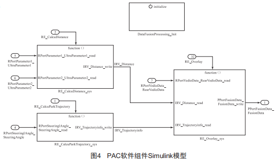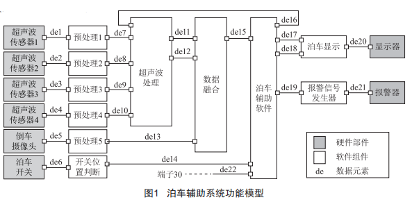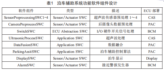 以泊車輔助功能為例,利用內(nèi)嵌在車后保險(xiǎn)杠上的4個(gè)接近傳感器(超聲波傳感器)探測后方障礙物,根據(jù)車輛接近障礙物的距離,發(fā)出不同頻率的警告聲。后視攝像頭提供倒車可視畫面,整個(gè)輔助系統(tǒng)可以由駕駛員使能(選擇激活或者不激活)。采用基于模型的功能開發(fā)思路,將系統(tǒng)的功能拆解為各個(gè)小功能塊,如傳感器數(shù)據(jù)預(yù)處理模塊、數(shù)據(jù)融合模塊、泊車輔助算法等,分別對(duì)應(yīng)不同的軟件組件(SWC),各功能塊之間通過AUT0SAR標(biāo)準(zhǔn)接口(如S/R、C/S接口等)進(jìn)行數(shù)據(jù)交互。泊車輔助系統(tǒng)的功能模型如圖1所示。