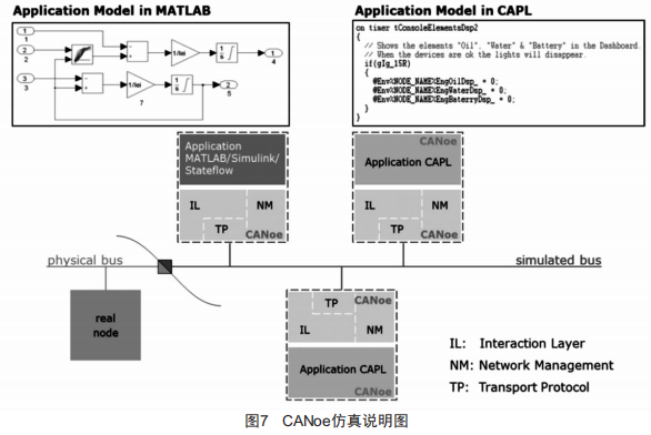 在前期系統(tǒng)功能設(shè)計(jì)過程中,可以輔助以仿真工具進(jìn)行模擬及驗(yàn)證確保前期功能邏輯以及通信矩陣設(shè)計(jì)的正確性。仿真的通信數(shù)據(jù)庫arxml文件由PREEviSiOn導(dǎo)出,導(dǎo)入CANOe中可自動(dòng)生成整個(gè)網(wǎng)絡(luò)模型。前期的功能邏輯可以由CAPL進(jìn)行編寫,也可以利用Simulink中搭建好的算法模型,轉(zhuǎn)化為d11庫文件。將d11文件導(dǎo)入CANOe仿真工程中對(duì)應(yīng)的節(jié)點(diǎn)便可進(jìn)行功能仿真,驗(yàn)證算法邏輯正確性。CANOe中系統(tǒng)仿真示意如圖7所示。