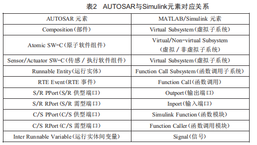 基于Simu1ink的軟件組件開發(fā)主要是對(duì)AUTOSAR軟件組件內(nèi)部行為(Interna1BehaviOr)的實(shí)現(xiàn),即實(shí)現(xiàn)運(yùn)行實(shí)體(Runnab1eEntity)中的內(nèi)部控制算法。PREEviSiOn/AUTOSAR中模型元素和MATLAB/Simu1ink元素對(duì)照如表2所示。