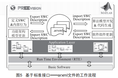 通過Simulink生成的AUTOSAR描述文件,反過來,也可以重新導(dǎo)入至PREEviSiOn中從而將軟件開發(fā)人員在Simulink中對(duì)軟件組件做出的修改同步到PREEviSiOn中完善功能架構(gòu)模型。二者之間的數(shù)據(jù)傳遞交互過程如圖5所示。