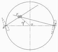 通過應(yīng)用擺動導(dǎo)桿滑塊機(jī)構(gòu)可實現(xiàn)上述擺線推進(jìn)器葉片擺動規(guī)律。如圖1所示,假設(shè)A、B兩點(diǎn)分別是兩個葉片的軸線,且兩葉片弦線的垂直線相交于點(diǎn)P,即控制點(diǎn)。當(dāng)葉片繞推進(jìn)器中心軸線0點(diǎn)逆時針旋轉(zhuǎn)角度a時,可假設(shè)葉片與推進(jìn)器相對靜止,控制點(diǎn)P繞中心軸線0順時針旋轉(zhuǎn)角度a。