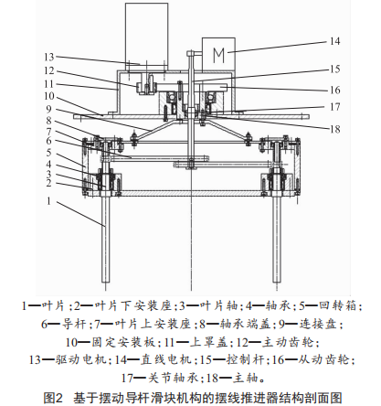 中心距控制機(jī)構(gòu),控制桿15以中間點(diǎn)為支點(diǎn),通過關(guān)節(jié)軸承17進(jìn)行固定并連接在主軸18上,兩個直線電機(jī)14與控制桿15上端連接,可分別控制其在X、y兩個方向上的位移大小,從而反向控制控制桿15下端的位移,控制桿15下端帶動導(dǎo)桿6和固連在導(dǎo)桿6上的葉片1一同擺動。
