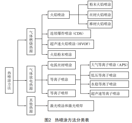 (4)噴涂操作程序簡(jiǎn)單,效率高,施工時(shí)間短,成本較低。熱噴涂方法一般可按照其熱源類(lèi)型進(jìn)行分類(lèi),在此基礎(chǔ)上再按照不同形式的涂層材料形成一系列的熱噴涂方法,如圖2所示。