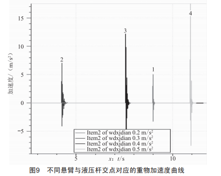 不同懸臂與液壓桿交點(diǎn)對(duì)應(yīng)的重物加速度曲線(xiàn)如圖9所示。圖中的曲線(xiàn)1、2、3、4分別對(duì)應(yīng)懸臂與液壓桿交點(diǎn)位置離重物懸掛點(diǎn)的距離為0.2m、0.3m、0.4m、0.5m(懸臂長(zhǎng)度為1m)時(shí)重物的位移曲線(xiàn)。由分析可知,當(dāng)懸臂與液壓桿交點(diǎn)位置離重物懸掛點(diǎn)的距離在0.2~0.3m內(nèi)時(shí)系統(tǒng)具有較好的穩(wěn)定性。