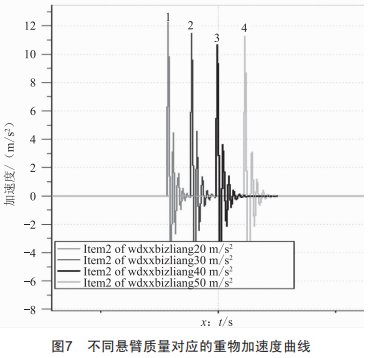 不同懸臂質(zhì)量對(duì)應(yīng)的重物加速度曲線(xiàn)如圖7所示。圖中曲線(xiàn)1、2、3、4分別對(duì)應(yīng)懸臂質(zhì)量為20kg、30kg、40kg、50kg時(shí)重物的位移曲線(xiàn)。由分析可知,當(dāng)懸臂質(zhì)量為40kg時(shí)系統(tǒng)的穩(wěn)定性較好。