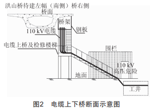 洪山大橋在建右幅橋右側(cè)和待建左幅橋左側(cè)已規(guī)劃外掛橋架用于低壓電纜和通信光纜等管線,在建右幅橋左側(cè)已規(guī)劃給水管和輸油管。因此,本工程電纜橋架外掛于洪山橋待建左幅橋的右側(cè),位于兩幅橋中間位置(對城市景觀幾乎無影響),橋架內(nèi)110kV電纜蛇形敷設并預留運檢維修通道,電纜不受日曬雨淋的影響。橋架通過新建橋的3、4、5號橋墩,長約260m。另外,在大橋兩側(cè)各新建一座電纜上下橋及運檢維修的樓梯,并于樓梯口修砌圍欄。
