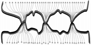 當觸頭觸指接觸時,接觸表面因灼、傷積灰等因素造成表面高低不平,在接觸時高的部分優(yōu)先接觸,形成接觸對,當施加載荷到一定值時,會擊穿接觸面的氧化膜形成電流導通點,電流匯聚到接觸點時受到約束后形成收縮電阻,如圖1所示。因此,在觸頭觸指檢修過程中,若打磨工藝不良,會使其接觸面粗糙,收縮電阻增大。