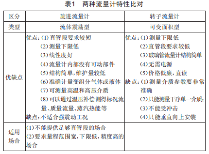旋進(jìn)流量計和轉(zhuǎn)子流量計的特性對比如表1所示。