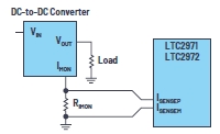 一個電源系統(tǒng)可能有一個輸入電源,其為多個下游穩(wěn)壓器供電。輸入電源電流可由LTC2971、LTC2972或LTC2975進(jìn)行測量。使用LTC2971/LTC2972/LTC2975測量IIN非常簡單,因為這些器件原本就有將引腳連接到VIN電流路徑中的檢測電阻RSNS的能力。IIN_SNS引腳的直接接線以VIN電源為限,對于LTC2972/LTC2975而言,該值<15V;對于LTC2971而言,該值<60V。