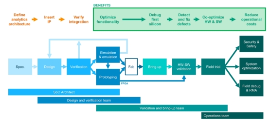 用于監(jiān)控和分析 IP 的片上基礎(chǔ)架構(gòu)和軟件提供了所有這些功能,覆蓋范圍可從仿真到部署。下圖即顯示了 SoC 功能監(jiān)控和分析的典型架構(gòu)。