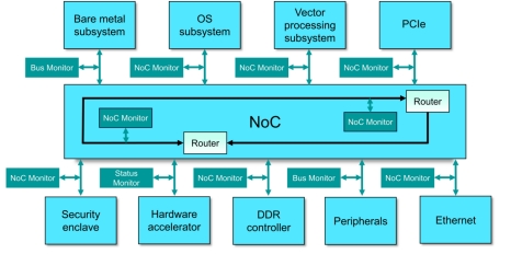 同一個(gè) NoC 監(jiān)視器也可配置為在檢測(cè)到相同死鎖條件時(shí)——例如通過跟蹤硬件加速器行為的狀態(tài)監(jiān)視器模塊——使用嵌入式分析消息基礎(chǔ)設(shè)施的交叉觸發(fā)功能,在系統(tǒng)中的其他位置觸發(fā)跟蹤。