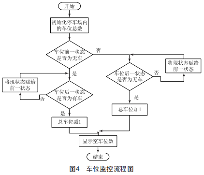 在停車場(chǎng)內(nèi)部的每個(gè)停車位下方嵌入一個(gè)對(duì)射式紅外傳感器,對(duì)每一個(gè)車位進(jìn)行編號(hào),當(dāng)紅外傳感器檢測(cè)到車位上沒有車輛時(shí),傳感器持續(xù)輸出高電平:當(dāng)有車輛停入停車位時(shí),紅外傳感器輸出轉(zhuǎn)變?yōu)榈碗娖?ZigBee終端節(jié)點(diǎn)對(duì)該變化信號(hào)進(jìn)行有效采集,再周期性地將其發(fā)送給協(xié)調(diào)器,協(xié)調(diào)器接收到該數(shù)據(jù)后進(jìn)行集中處理,通過對(duì)每個(gè)停車位上的傳感器狀態(tài)進(jìn)行周期性檢測(cè),實(shí)現(xiàn)對(duì)停車場(chǎng)內(nèi)車位的實(shí)時(shí)監(jiān)測(cè)。車位監(jiān)控流程如圖4所示。