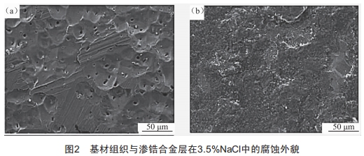 在3.5%NaCl溶液中不銹鋼基材組織與滲錯合金層的腐蝕形貌如圖2所示。從圖2(a)可以看出,基材組織在3.5%NaCl溶液中有嚴(yán)重的腐蝕現(xiàn)象,不但出現(xiàn)面腐蝕甚至還出現(xiàn)小孔腐蝕。這是由于在NaCl溶液中存在半徑較小的氯離子,氯離子經(jīng)過一系列反應(yīng)最終發(fā)生蝕孔現(xiàn)象。從圖2(b)可以看出,滲錯合金層表面在3.5%NaCl溶液中僅出現(xiàn)局部腐蝕。這是為經(jīng)滲錯處理的組織與不銹鋼基材組織相比,試樣表面鈍化膜的載流子密度很低,使氯離子難以吸附在表面,從而抑制了蝕孔現(xiàn)象的發(fā)生。