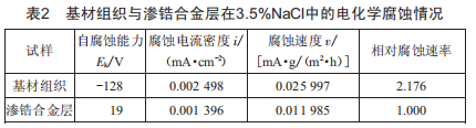 在NaCl溶液中檢測基材組織與滲錯合金層的電化學(xué)腐蝕性能,通過相應(yīng)的實驗記錄以及計算,得出腐蝕速度⑦、腐蝕電流i及相對腐蝕速度的結(jié)果如表2所示。從表2可知,在陰極極化過程中,基材組織的電流密度隨著電位的逐漸升高而降低,陽極極化在電位升高到_275mV后開始發(fā)生,隨后電流密度隨著電位升高而增大,最后進入活化與鈍化過渡區(qū)。在電位升高到251mV后,電流密度趨于平緩伴隨穩(wěn)定鈍化現(xiàn)象的發(fā)生,此時不銹鋼基材組織具有一定的耐蝕性。對于滲錯層具有類似的規(guī)律,所不同的是陽極極化開始發(fā)生是在電位升高到_195mV后,與基材組織相比腐蝕電位提高了80mV,從熱力學(xué)角度說明滲錯層與基材組織相比,其耐腐蝕性更好。另一個不同之處是鈍化現(xiàn)象出現(xiàn)是在電位升至214mV后,并且滲錯層的腐蝕電流密度和腐蝕速度明顯小于基材組織腐蝕電流密度和腐蝕速度,從動力學(xué)角度說明滲錯層與基材組織相比,其耐腐蝕性更好。