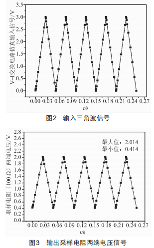 在仿真電路中的v-1變換模塊輸入端設(shè)置一個三角波信號源,幅值為0~3v,頻率為20Hz。電流取樣電阻阻值設(shè)置為100Q。輸出電流的大小可以通過測量取樣電阻(100Q)兩端的電壓間接得到。