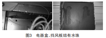 電器盒左上角結(jié)有一些小水珠,但未見有水珠滴落。擋風(fēng)板表面結(jié)有少量水珠,并有水珠滴落,如圖3所示。