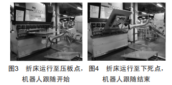 通過I/0信號控制折床與機(jī)器人的動作。機(jī)器人將工件移動到折床下模上方,使工件完全貼合模具,再推動工件移動,直到后定規(guī)上的感應(yīng)開關(guān)打開,折床接收到感應(yīng)開關(guān)信號后開始執(zhí)行折彎動作,機(jī)器人通過編碼器獲取折床的上死點(diǎn)、壓板點(diǎn)、下死點(diǎn)的工具坐標(biāo),同時計(jì)算出工件在折彎過程中的運(yùn)動路徑,并沿著路徑與折床同步運(yùn)動,從而完成折彎跟隨動作。折床下壓至下死點(diǎn)后快速回到上死點(diǎn),機(jī)器人帶著工件退出折床,完成一次自動折彎。驗(yàn)證過程如圖3、圖4所示。