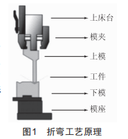折彎工藝原理如圖1所示,將上、下模分別固定于折床的上、下工作臺上,利用馬達(dá)產(chǎn)生的動力驅(qū)動工作臺相對運(yùn)動,結(jié)合上、下模形狀,從而實(shí)現(xiàn)對板材的折彎成型。