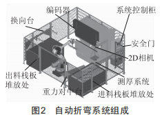 自動折彎系統(tǒng)主要由以下幾部分組成:折床、機(jī)器人、夾爪、重力對中臺、上下料臺、分料機(jī)構(gòu)、測厚系統(tǒng)、換向臺、編碼器等,如圖2所示。