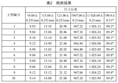 使用200Pcs工件對自動折彎效果及穩(wěn)定性進(jìn)行驗(yàn)證,并抽檢10Pcs成品對折彎角度及尺寸進(jìn)行檢測,結(jié)果如表2所示。由檢測結(jié)果可以看出,工件經(jīng)機(jī)器人自動折彎后的角度及尺寸都在公差范圍內(nèi),由此可見該自動折彎方案可行。