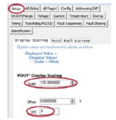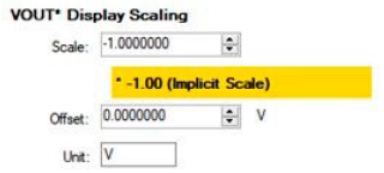 輸入VOUT顯示比例框中的值應(yīng)等于1/RSNS。如果使用外部CSA,需要將比例系數(shù)設(shè)置為1/(GAINCSA/RSNS)。其中有一個顯示單位字段,通過將V更換為A,可以將伏特改為安培。這樣就可以顯示經(jīng)過計算的電流讀數(shù),該電流與基于電路中的檢測電阻得到的實際電流一致。例如,如果RSNS為10 mΩ (0.01 Ω),則VOUT顯示比例為100。READ_VOUT寄存器現(xiàn)在會報告一個mA值,反映芯片測量的每mV的100 mA。在本例中,對RSNS為10 mΩ的電源軌施加592 mA負載,則芯片的測量值為5.92 mV。注意:設(shè)置下的比例/偏置值不會保存至器件的NVM,但會保存至.proj文件。