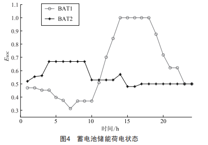 圖3所示為DG在不同時段下的功率輸出情況,圖中PV和wT受不同時段的出力限制,MT為全功率輸出。圖4所示為蓄電池在一天24個時段的荷電狀態(tài)分布,兩個蓄電池相互協(xié)調(diào),在負荷較重時放電,在負荷較輕、間歇性能源充足時充電。結合圖3和圖4分析可知,蓄電池儲能根據(jù)主動配電網(wǎng)中的負荷需求及DG的出力大小做出充電/放電響應。