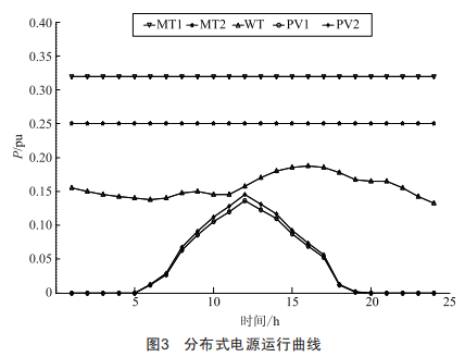 主動配電網(wǎng)能對于小幅度的負荷及間歇式功率波動做出實時響應,以修正實際負荷曲線及間歇式能源發(fā)電出力曲線與預測曲線的偏差,緩解功率波動。本文采用的間歇性DG為wT和PV,利用微型柴油發(fā)電機(MicroTurbine,MT)配合以平滑間歇性分布式電源的功率波動,減少配電網(wǎng)中的缺供電量。