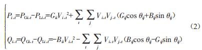 式中,PGi,t,0Gi,t為DG在時段t節(jié)點i的有功功率;PLi,t,0Li,t為時段t節(jié)點i的負荷需求;vi,t為時段t節(jié)點i的電壓水平;Gij、Bij、9ij為系統(tǒng)拓撲參數(shù)。