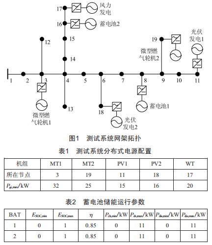 近年來,國內(nèi)外研究人員在主動配電網(wǎng)中對DG的優(yōu)化配置展開探索。文獻構建了包含分布式可再生能源接入微網(wǎng)系統(tǒng)的隨機多目標經(jīng)濟調(diào)度模型。文獻建立了多時間尺度獨立微電網(wǎng)能量優(yōu)化模型,優(yōu)化了發(fā)電單元的啟停機狀態(tài)及其有功出力值。文獻、文獻構建了分布式儲能在電力系統(tǒng)中的優(yōu)化配置模型,考慮了DG的實時出力對模型的影響。