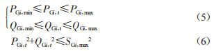 式中,PGi,max、PGi,min為DG有功出力的上下限;0Gi,max、0Gi,min為DG無功出力的上下限;SGi,max為DG的容量最大值。