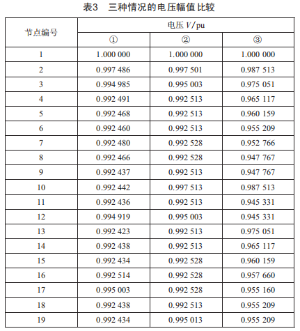如表3所示,①列表示利用二階錐優(yōu)化模型求解的電壓分布:②列表示將首節(jié)點作為松弛節(jié)點,DG接入的節(jié)點作為恒功率輸入節(jié)點求解得到的電壓分布:③列表示DG并未接入配電網(wǎng)中,系統(tǒng)中的負荷是通過首節(jié)點所連主網(wǎng)輸送計算得到的電壓分布。對比①和②列,最大偏差量為0.00094。可見,二階錐優(yōu)化能夠準確實現(xiàn)潮流求解。對比①、②和③可知,通過DG接入配電網(wǎng),能就近將電能提供給負荷,減少由于長距離功率輸送引起的電壓降,提高了電壓水平,改善了電能質量。