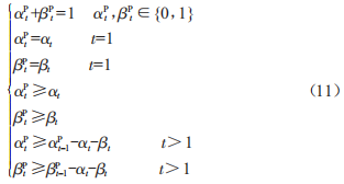 為構建蓄電池充放電過程,引入0-l變量aP4和8P4。其中,aEQ \* jc3 \* hps10 \o\al(\s\up 3(=l,8EQ \* jc3 \* hps10 \o\al(\s\up 3(=0表示蓄電池完成一次放電過程,反之為充電過程。蓄電池的時段4充放電過程與前一時段4-l緊密相關。