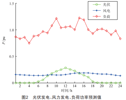 如圖2所示,間歇性能源與負荷隨時間而波動,二者的峰值將在不同時段出現(xiàn)。當負荷出現(xiàn)峰值而間歇性能源出力較弱時,重負荷需要通過首端配變根節(jié)點輸送功率,進而拉低負荷節(jié)點電壓,引起較大的網(wǎng)絡損耗。而當間歇性能源達到峰值時,因負荷較輕而棄風、棄光。