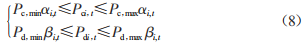 式中,Pc,max和Pc,min分別表示充電功率的上下限;Pd,max和Pd,min分別表示放電功率的上下限;Pci,t和Pdi,t分別表示時段t在節(jié)點i上蓄電池的充、放電功率。