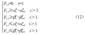 為了進一步表示蓄電池的狀態(tài)轉換過程,引入0-l變量Fi,4以記錄蓄電池的充放電過程切換,即當且僅當aEQ \* jc3 \* hps10 \o\al(\s\up 3(l=l、aEQ \* jc3 \* hps10 \o\al(\s\up 3(=0或者aEQ \* jc3 \* hps10 \o\al(\s\up 3(l=0、aEQ \* jc3 \* hps10 \o\al(\s\up 3(=l時,蓄電池才發(fā)生充放電過程的切換,則Fi,4滿足以下約束條件: