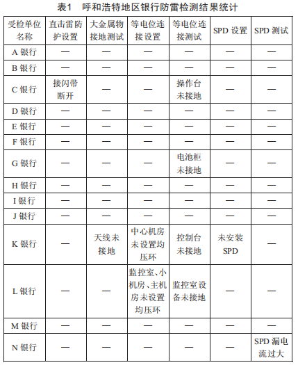 呼和浩特地區(qū)銀行系統(tǒng)的防雷檢測工作質量較高,從近幾年的檢測報告統(tǒng)計結果來看,檢測項目較為全面,數(shù)據(jù)詳細,可參考性較高。表1是呼和浩特地區(qū)各家銀行分行最近一次的防雷檢測結果統(tǒng)計。