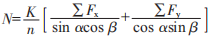 式中,N為系纜力標(biāo)準(zhǔn)值:ZFx、ZFy分別為可能同時(shí)出現(xiàn)的風(fēng)和水流對(duì)船舶作用產(chǎn)生的橫向風(fēng)力總和及縱向風(fēng)力總和(kN):K為系船柱受力分布不均勻系數(shù),當(dāng)實(shí)際受力的系船柱數(shù)目n=2時(shí),K取1.2,n>2時(shí),K取1.3:n為計(jì)算船舶同時(shí)受力的系船柱數(shù)目:α為系船纜的水平投影與碼頭前沿線所成的夾角(°):8為系船纜與水平面之間的夾角(°)。