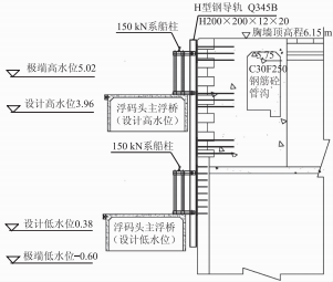依托現(xiàn)有直立岸壁和浮橋結(jié)構(gòu),考慮設(shè)計(jì)一種新型的可隨浮橋升降而上下滑動(dòng)的系船設(shè)施結(jié)構(gòu)。該結(jié)構(gòu)的軌道設(shè)置于直立岸壁上,結(jié)構(gòu)底部不與浮箱固定連接,只放置于浮箱頂面,浮箱上升時(shí),可推動(dòng)其隨之向上滑動(dòng):浮箱下降時(shí),該系船結(jié)構(gòu)依托自身重力及系攬力豎直向下分力的作用隨之向下滑動(dòng)。增設(shè)1.0kN系船柱后浮橋斷面如圖2所示。
