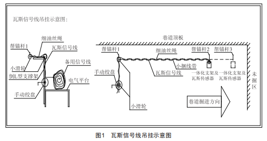 在滑輪的出口處預(yù)留夠拉緊細(xì)油絲繩的位置,開始把瓦斯信號(hào)線與細(xì)油絲繩使用小型捆線帶每隔300mm拉緊并捆扎一處,一直捆扎到細(xì)油絲繩距離掘進(jìn)工作面迎頭的一端,剩下的備用瓦斯信號(hào)線盤放在用于吊掛瓦斯傳感器的一體化支架上。絞動(dòng)手動(dòng)絞盤,拉緊細(xì)油絲繩,隨著細(xì)油絲繩的拉緊,附著在細(xì)油絲繩上的瓦斯信號(hào)線也一并拉起并成一條直線。