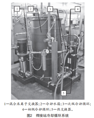 焊接站采用高頻感應(yīng)原理,對(duì)預(yù)成型的散熱管進(jìn)行縱縫焊接,主要結(jié)構(gòu)包括底座、導(dǎo)向輪組件、焊接輪組件和冷卻循環(huán)系統(tǒng),導(dǎo)向輪組件和焊接輪組件依次設(shè)在底座上。焊接站結(jié)構(gòu)如圖1所示,冷卻循環(huán)系統(tǒng)如圖2所示。