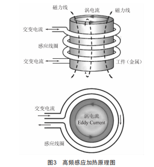 高頻焊接站采用高頻感應(yīng)加熱原理,通過(guò)渦流實(shí)現(xiàn)加熱。將焊接工件置于感應(yīng)器內(nèi),當(dāng)感應(yīng)器中有交流電流通過(guò)時(shí),在感應(yīng)器及焊接工件周圍產(chǎn)生交變磁場(chǎng),同時(shí)在焊接工件內(nèi)部相應(yīng)產(chǎn)生感應(yīng)電勢(shì),而在零件表面產(chǎn)生感應(yīng)電流,其方向與通入的交變電流方向相反,呈渦流流通,感應(yīng)電流會(huì)產(chǎn)生熱量加熱焊接工件。高頻感應(yīng)加熱原理如圖3所示。