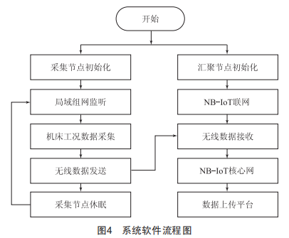系統(tǒng)上電后,首先進行初始化,采集節(jié)點自組局域網(wǎng),NB-IoT模塊聯(lián)網(wǎng)成功后開始進行通信。采集節(jié)點之間采用優(yōu)化蟻群自組路由算法,將機床工況數(shù)據(jù)按照自定義的幀格式打包發(fā)送,利用NB-IoT網(wǎng)絡經(jīng)核心網(wǎng)將數(shù)據(jù)上傳至數(shù)據(jù)平臺。