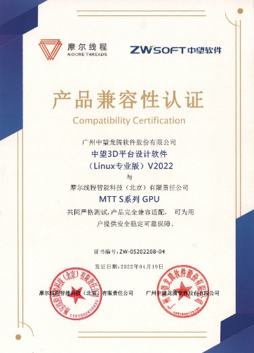 圖:中望3D 2022與MTT S系列GPU兼容性認(rèn)證證書