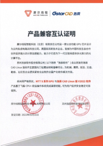 摩爾線程MTT S系列GPU與浩辰CAD Linux版V2022軟件兼容性認(rèn)證證書