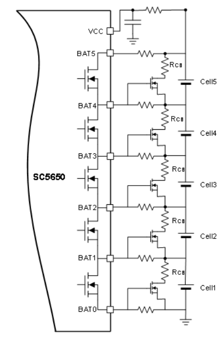 多串電池在使用中容易產(chǎn)生電芯不均衡問題,影響電池的使用壽命。與SC5550 同系列的SC5650, 在支持SC5550的基礎(chǔ)上,集成了100mA 的均衡功能。如果需要更高均衡電流,也可以通過外加MOSFET拓展外部均衡電路。