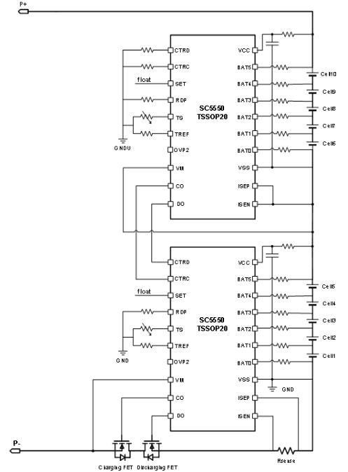 如有高壓高功率需求,需要用到6節(jié)以上串聯(lián)電池,SC5550支持可堆疊設(shè)計,單顆SC5550支持2~5串電池,通過2~3顆SC5550 堆疊,將可支持的串?dāng)?shù)拓展到6~15S。