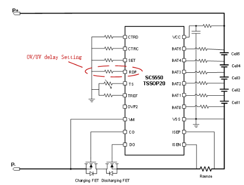SC5550支持充電過壓保護(hù)OVP(保護(hù)點從3.0 V 到4.575V可選)、放電欠壓保護(hù)UVP(保護(hù)點從1.2V到3.0V可選),涵蓋磷酸鐵鋰、鋰離子/鋰聚合物等多種鋰電池。此外,SC5550的OVP和UVP保護(hù)檢測延時可以通過專用管腳RDP電阻進(jìn)行配置,支持用戶靈活配置保護(hù)延時參數(shù)。